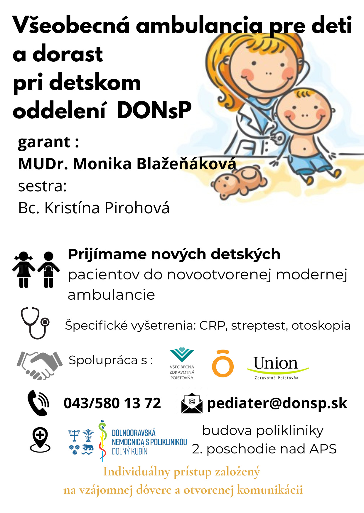 Dovoľujeme si Vás osloviť ako všeobecná ambulancia pre deti a dorast pôsobiaca pri detskom oddelení DONsP. Zároveň je dôležité spomenúť, že nie sme súkromným zdravotníckym zariadením.