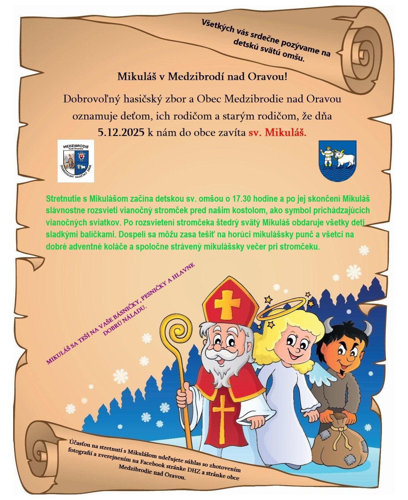 DHZ a obec Medzibrodie nad Oravou týmto oznamuje deťom a ich rodičom, že dňa 5. 12.2025 do obce zavíta sv. Mikuláš, zároveň pozývame všetkých o 17.30 hod. na detskú svätú omšu.