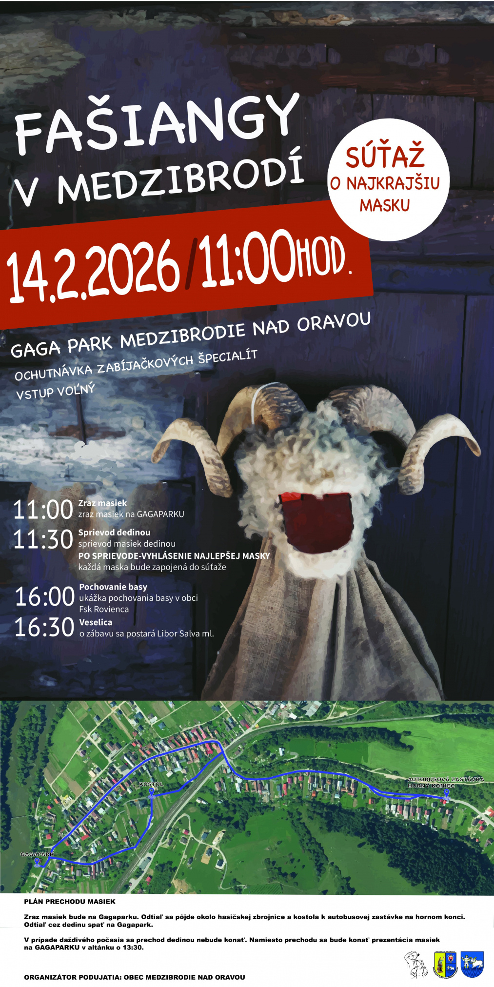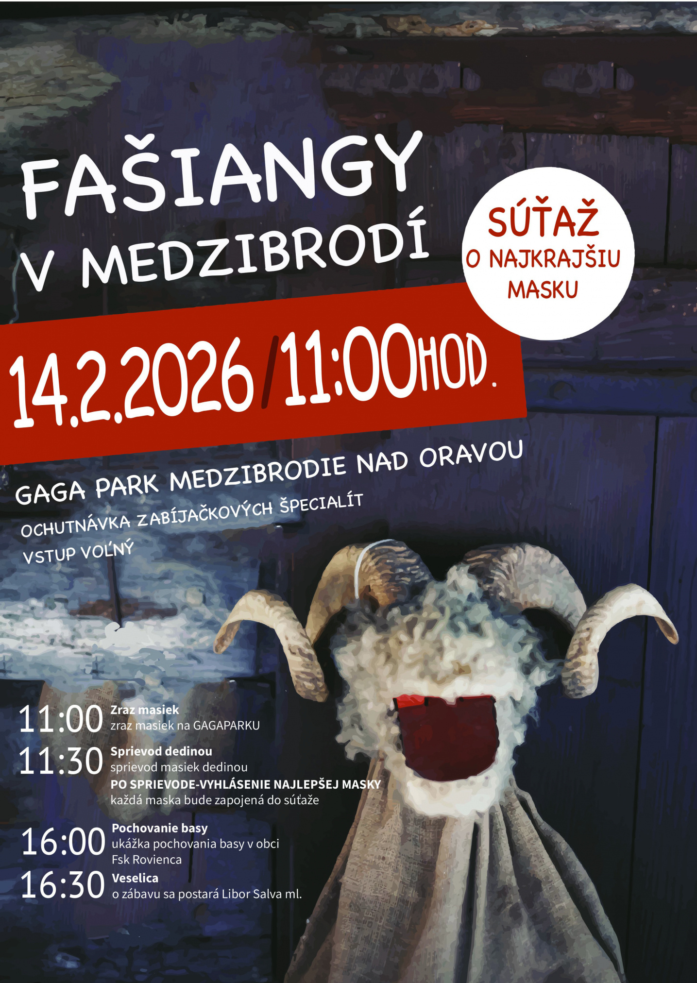 Dňa 14. februára 2026, t.j. v sobotu Vás pozývame na GAGA PARK na fašiangový sprievod masiek našou obcou, pochovanie basy a fašiangovú veselicu. Všetko bude spojené s ochutnávkou zabíjačkových špecialít.
